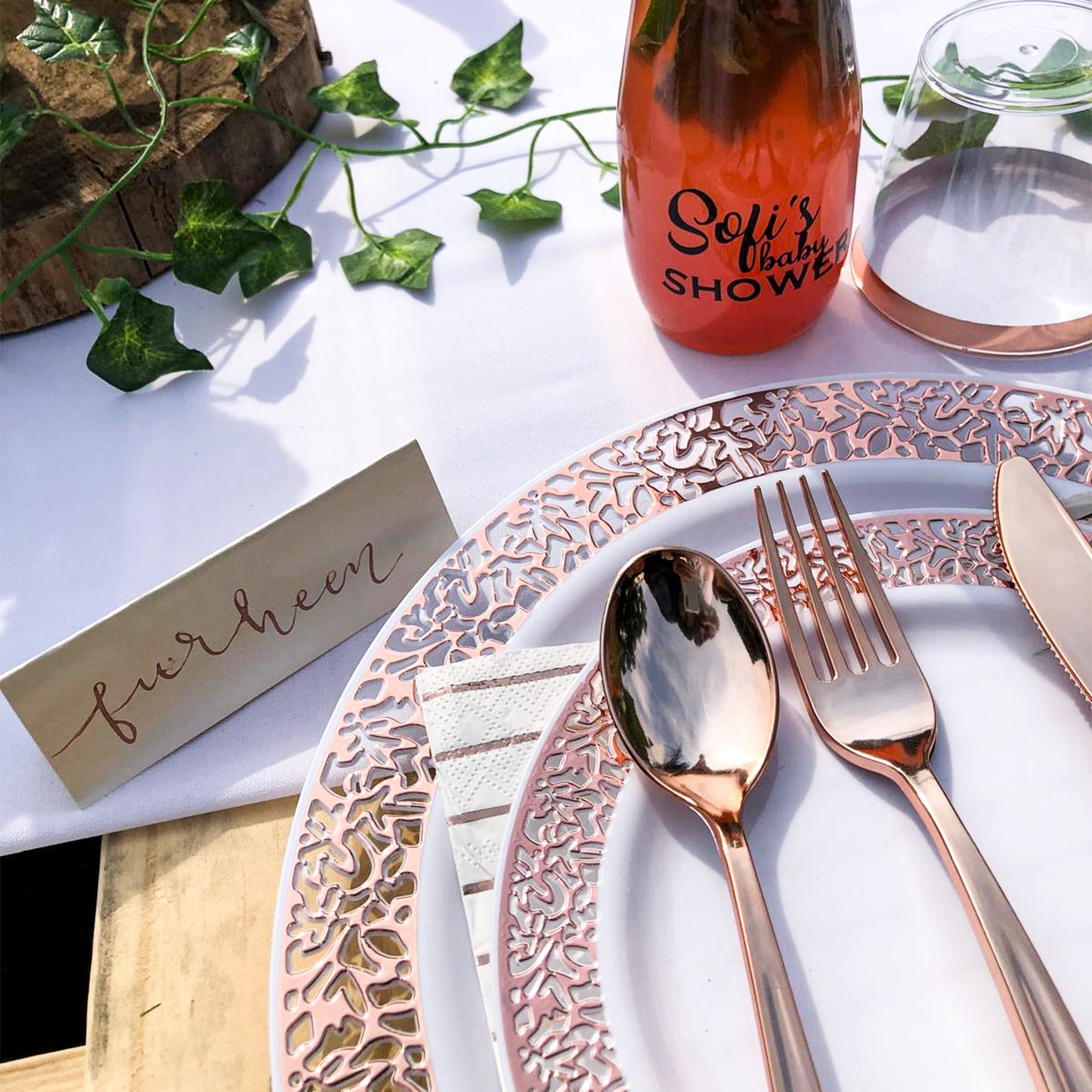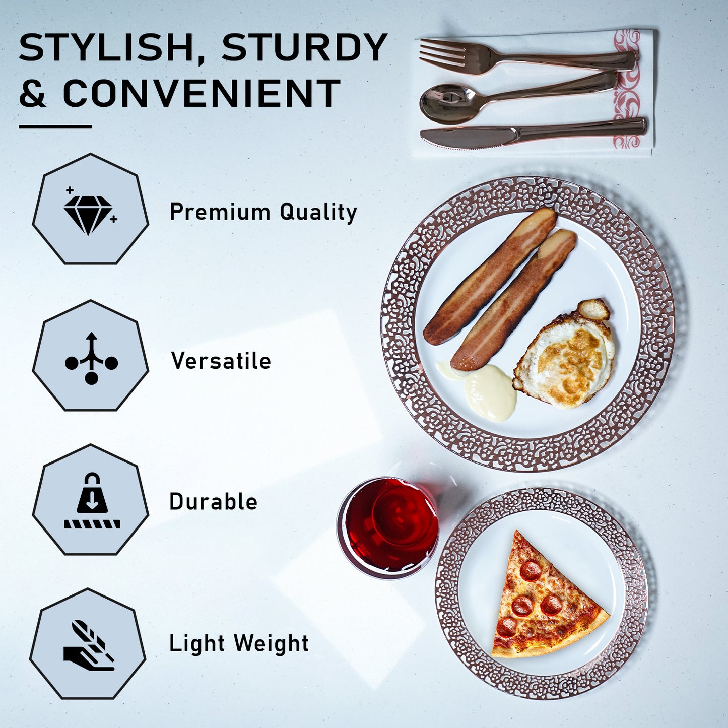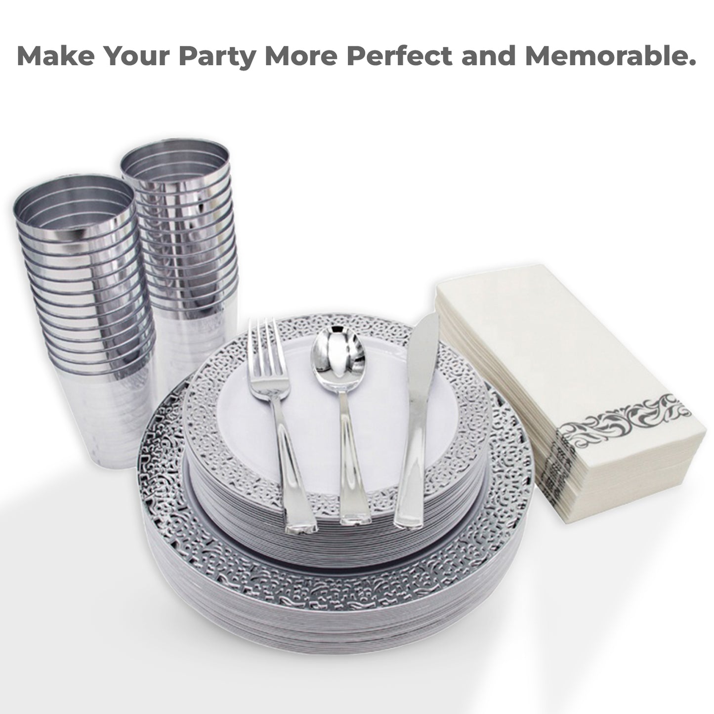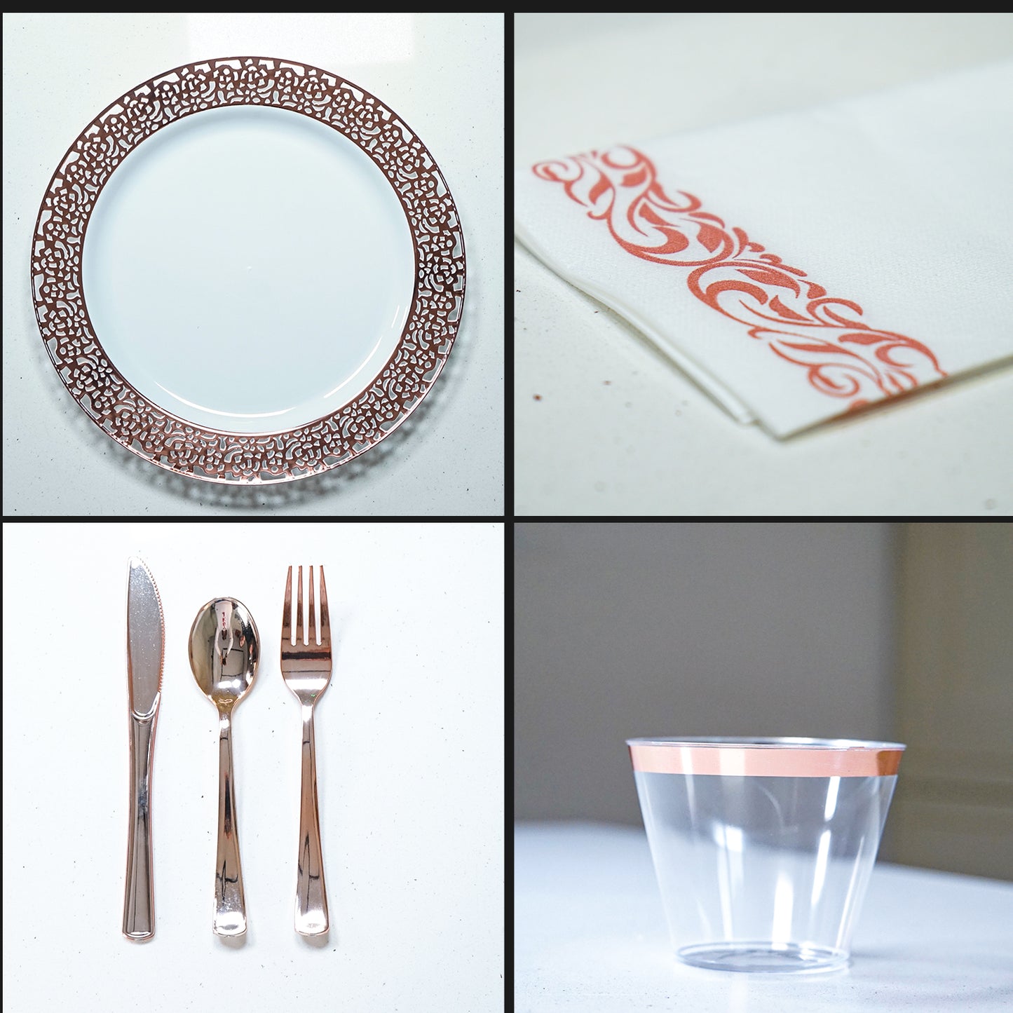 Elevate your events with this 175-piece all-in-one dinnerware set. Includes plates, cutlery, cups, and napkins with elegant metallic accents. Durable, disposable, and available in silver, gold, rose gold, or black/gold, perfect for weddings, parties, and sophisticated gatherings.