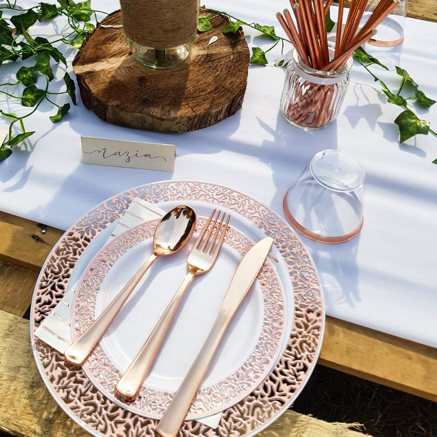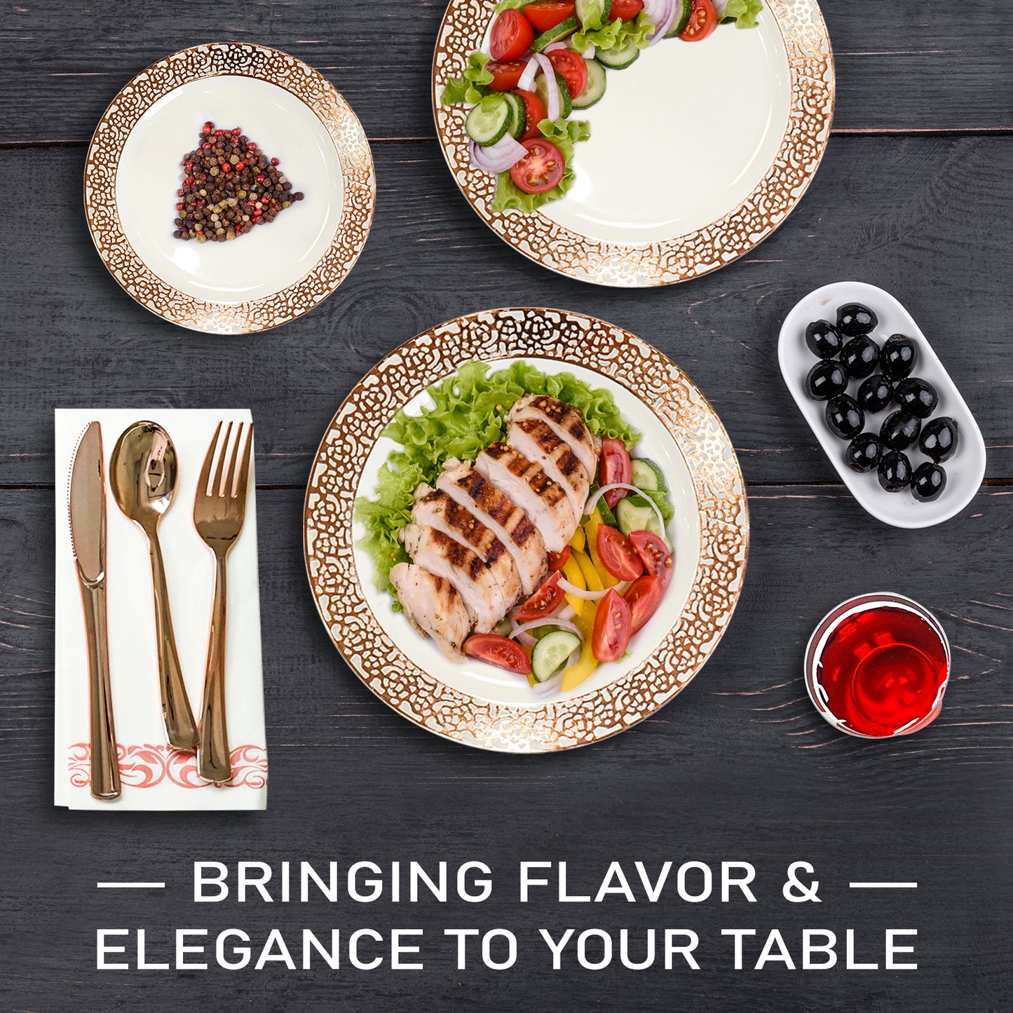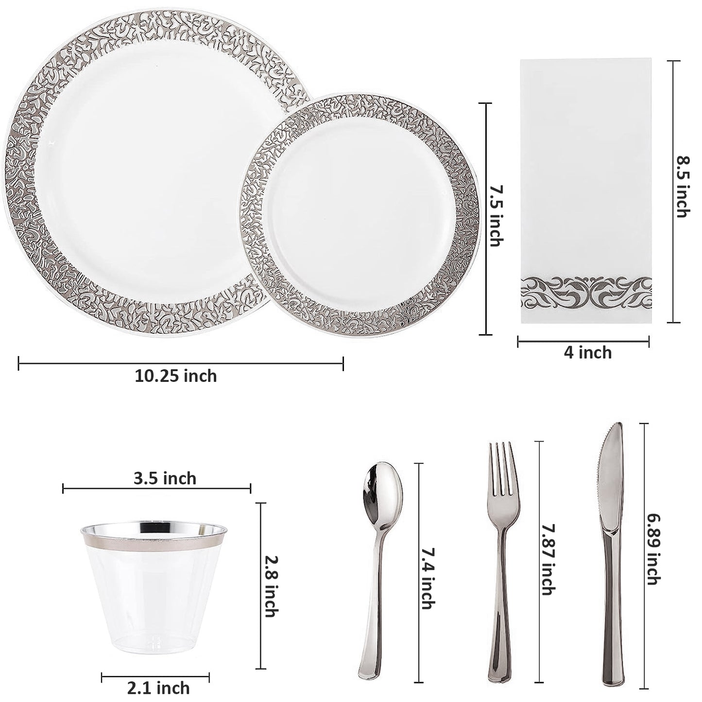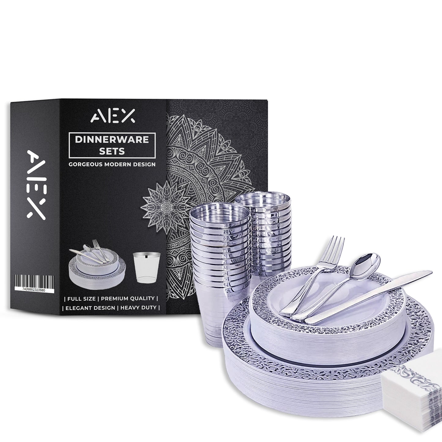 Elevate your events with this 175-piece all-in-one dinnerware set. Includes plates, cutlery, cups, and napkins with elegant metallic accents. Durable, disposable, and available in silver, gold, rose gold, or black/gold, perfect for weddings, parties, and sophisticated gatherings.