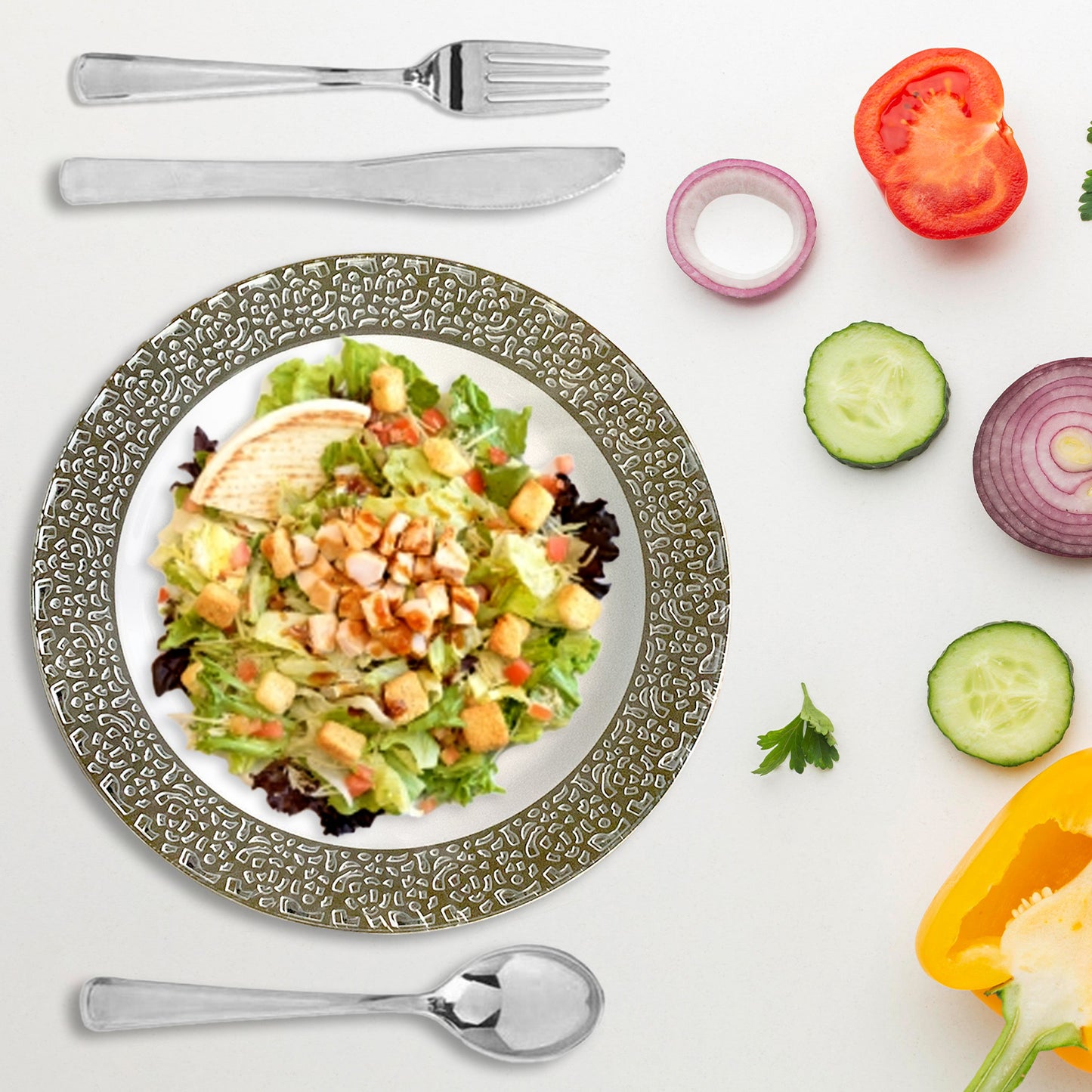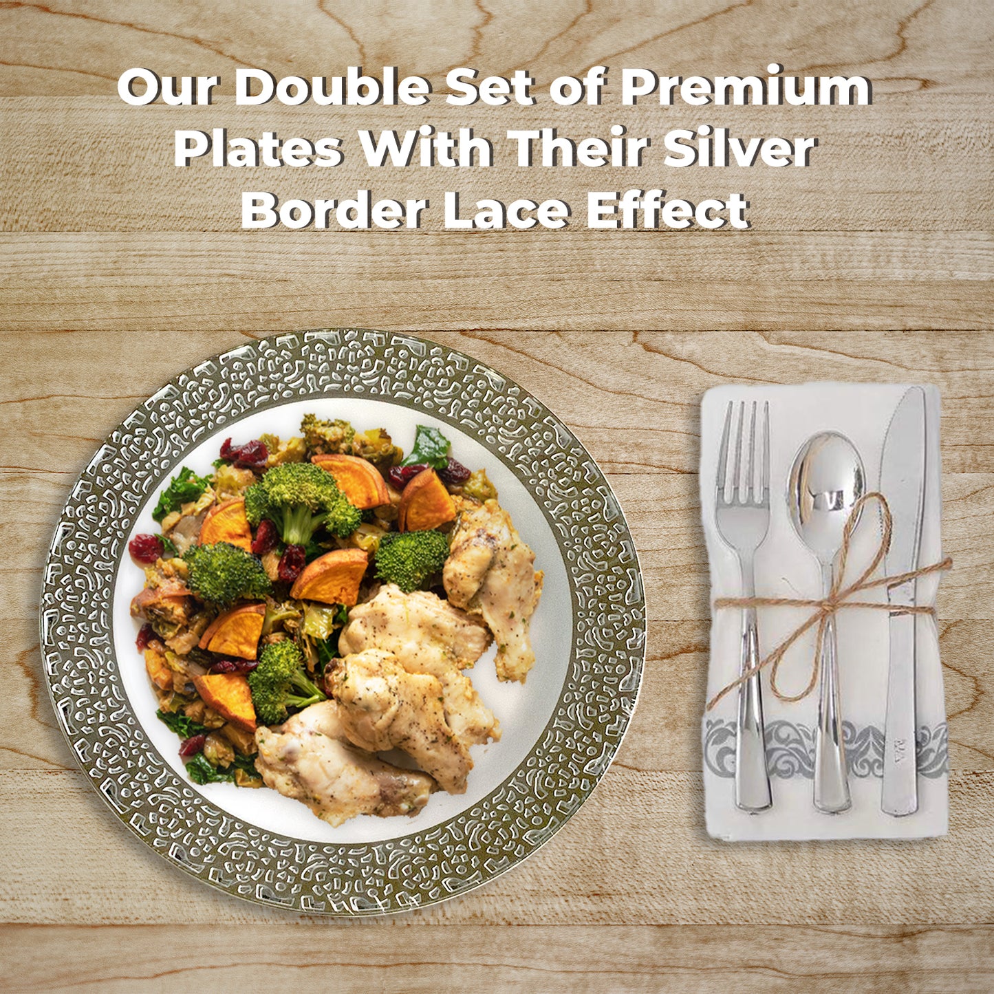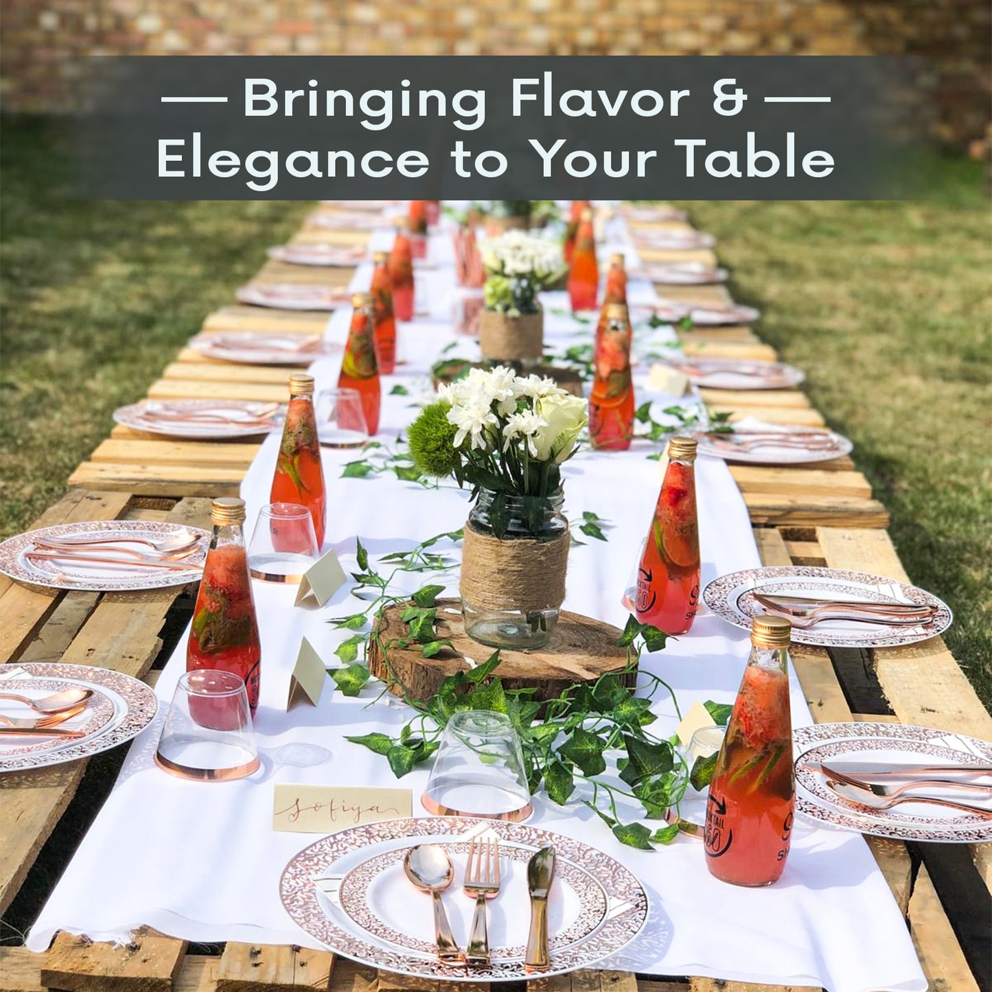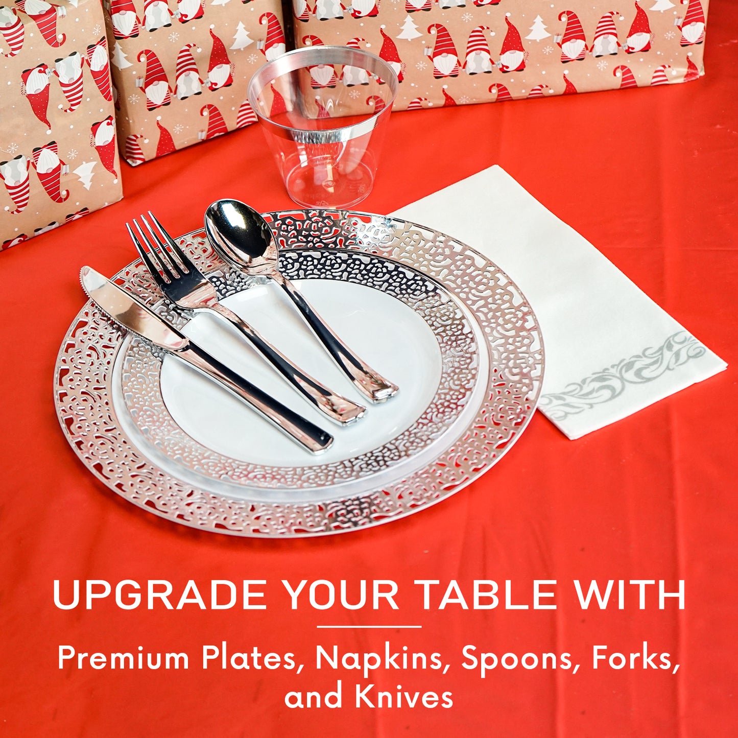 Elevate your events with this 175-piece all-in-one dinnerware set. Includes plates, cutlery, cups, and napkins with elegant metallic accents. Durable, disposable, and available in silver, gold, rose gold, or black/gold, perfect for weddings, parties, and sophisticated gatherings.