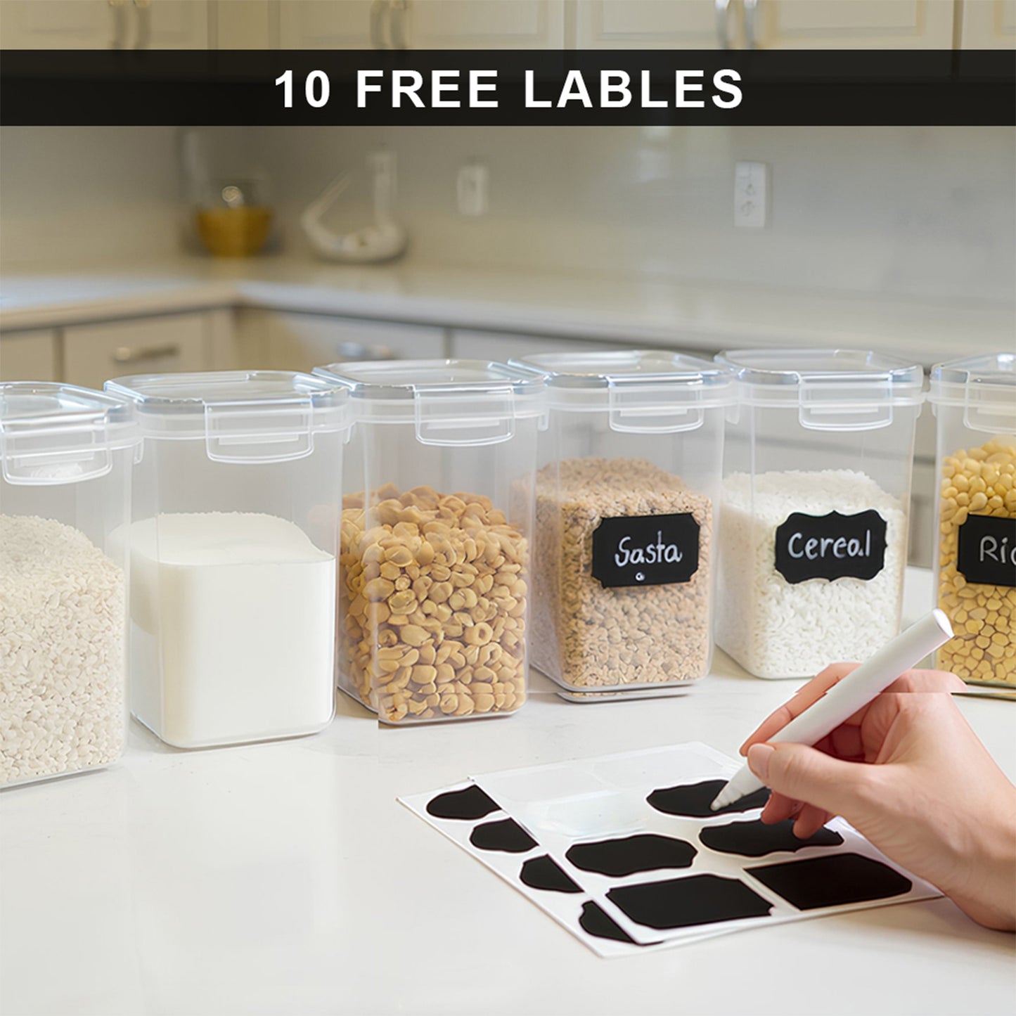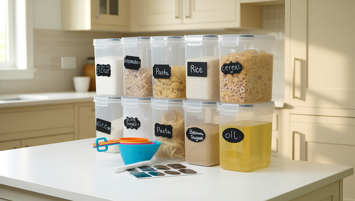 Keep your pantry organized with this 10-piece cereal storage container set. Airtight, BPA-free, and stackable, each container includes locking lids, chalkboard labels, and measuring scoops. Perfect for cereals, pasta, sugar, and dry foods.