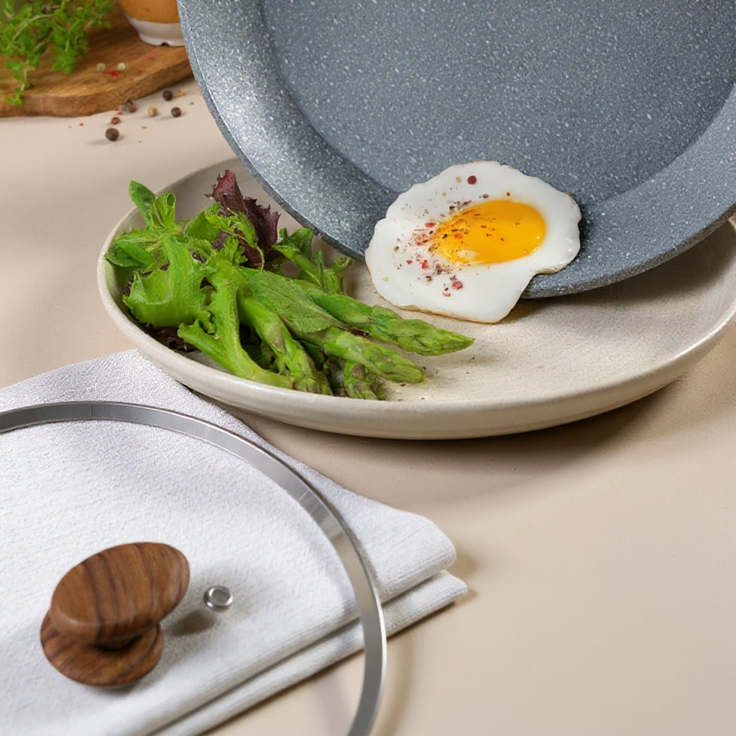 The 24cm Nonstick Frying Pan with Lid combines durability, style, and convenience. With a thick aluminium body, induction base, and nonstick coating, it ensures even heating and easy cleanup. The glass lid locks in flavour, while the ergonomic oven-safe handle makes it perfect for all stovetops.