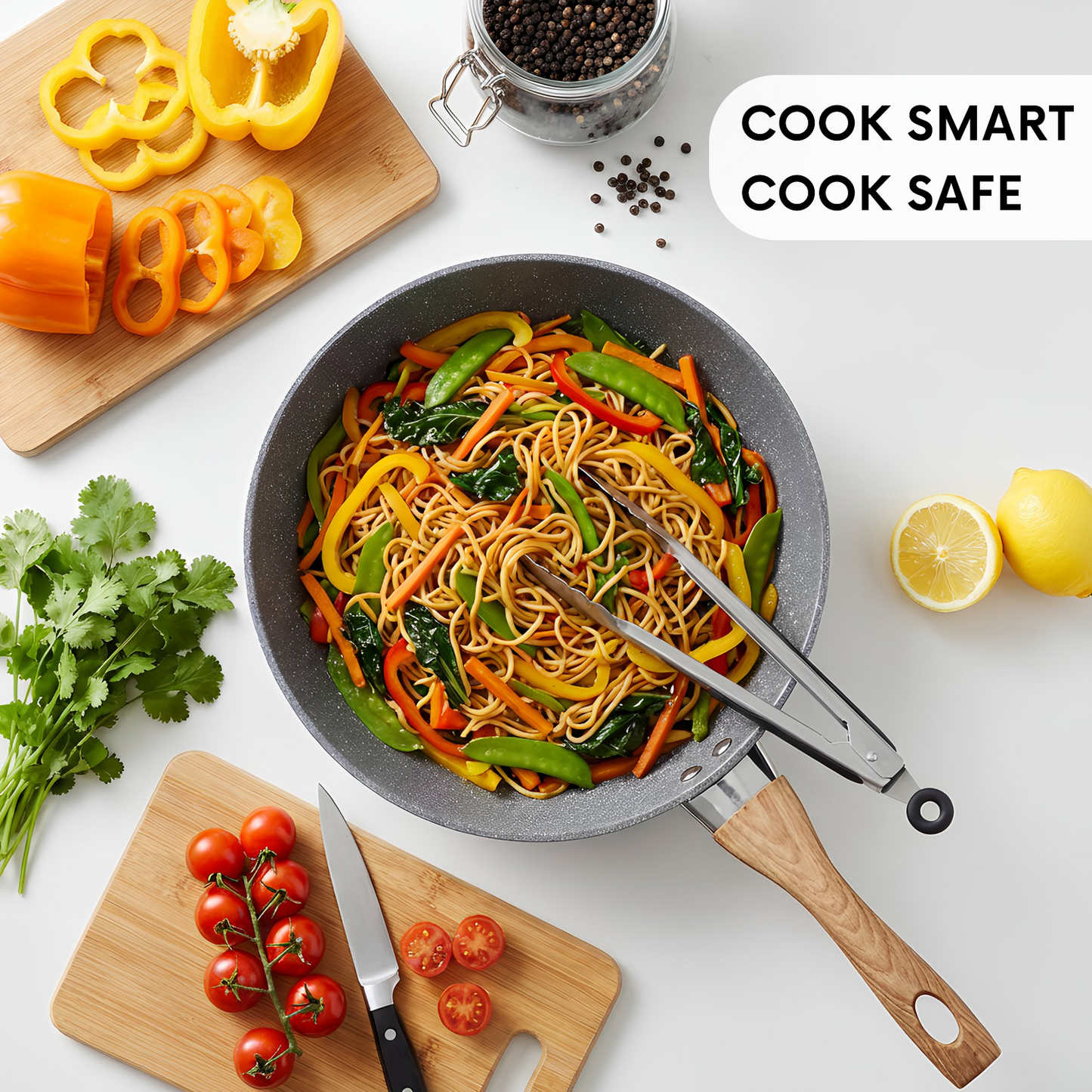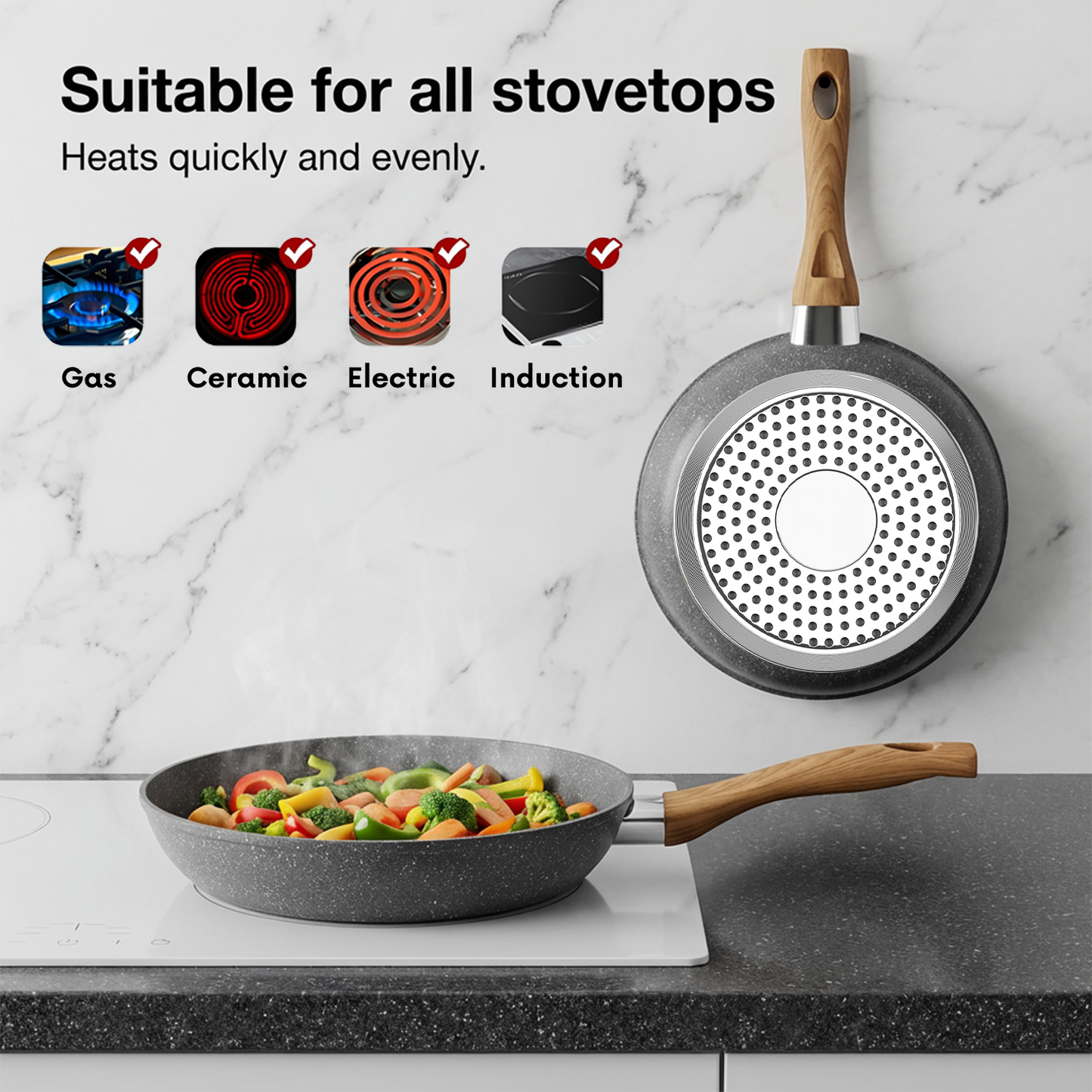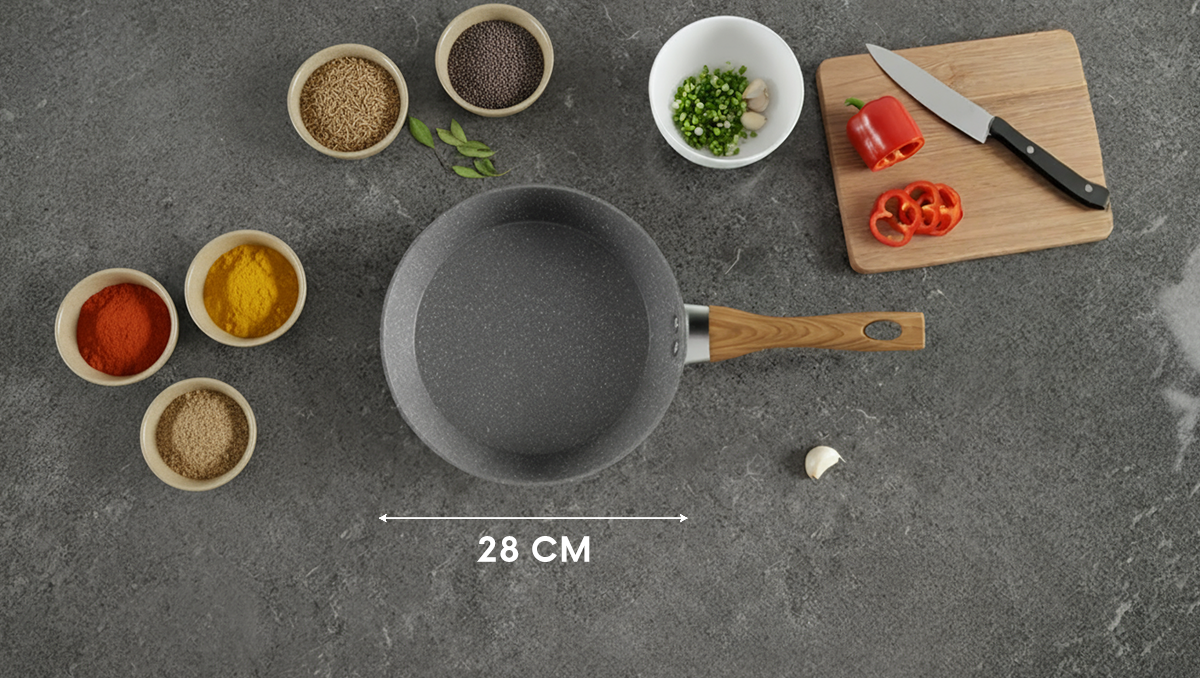 Cook with ease using this 28cm nonstick frying pan with lid. Featuring a PFOA-free non-stick surface, durable die-cast aluminium body, induction-compatible base, glass lid, and heat-resistant ergonomic handle, it’s perfect for versatile everyday cooking.
