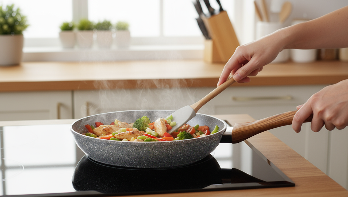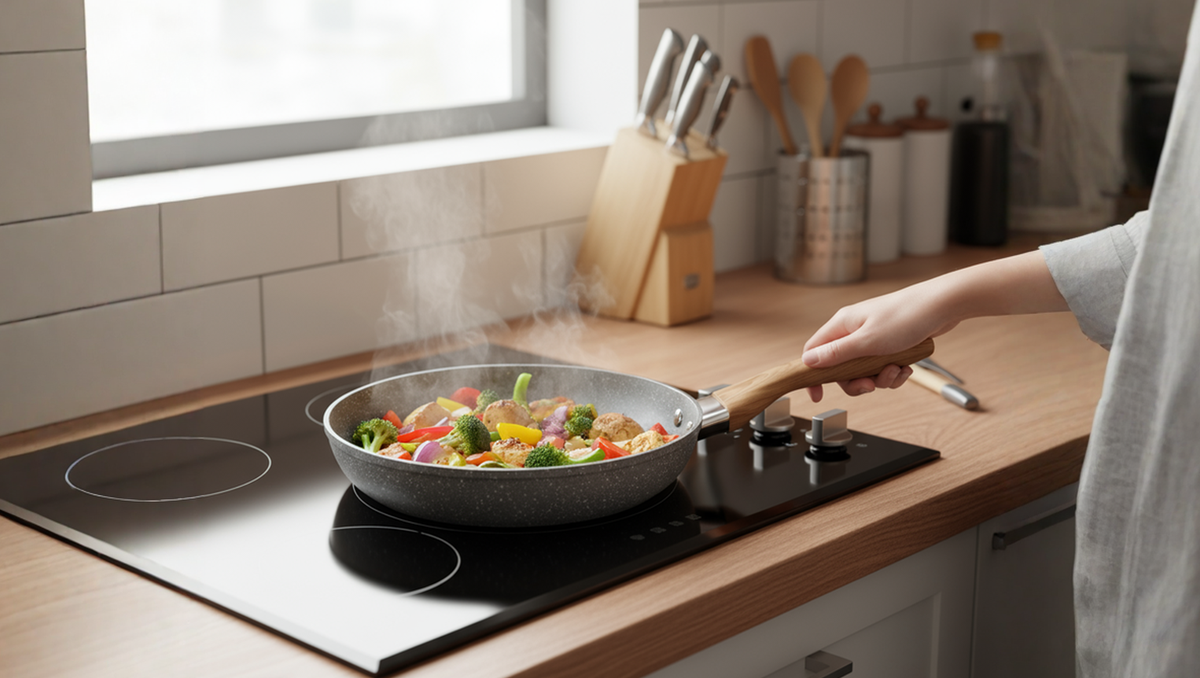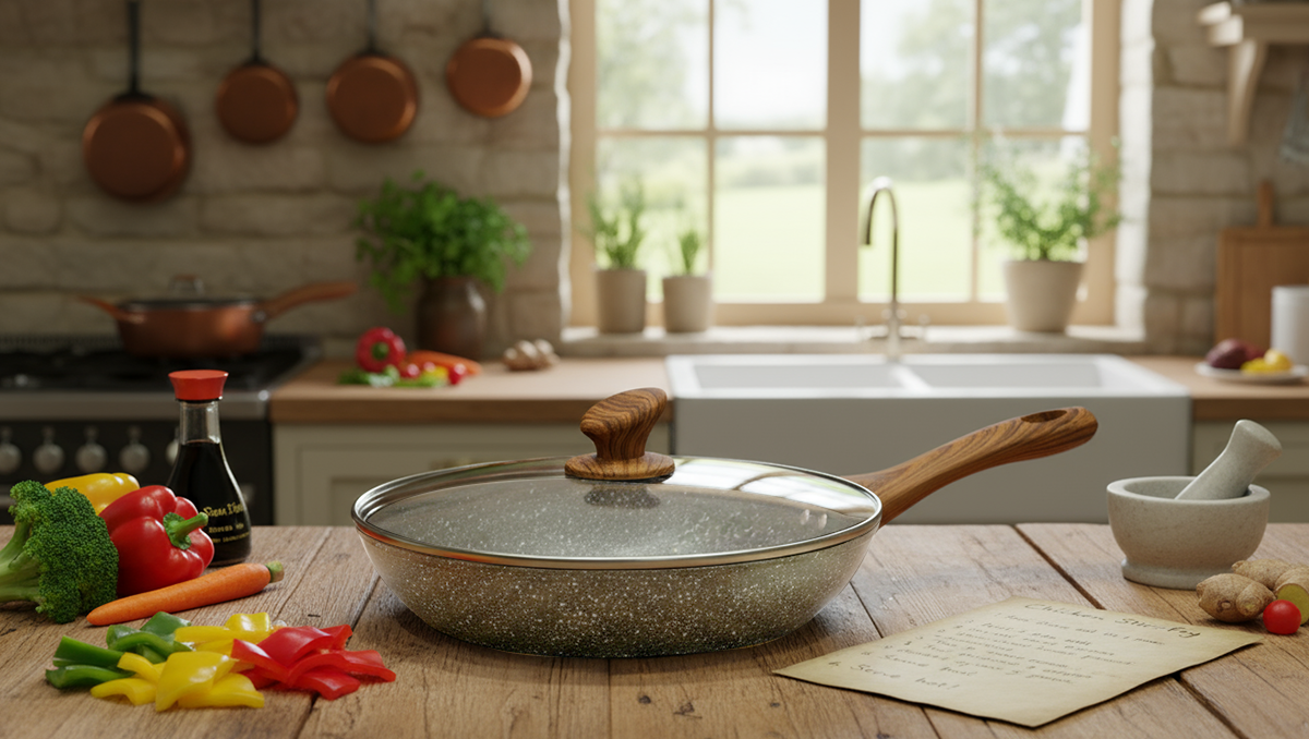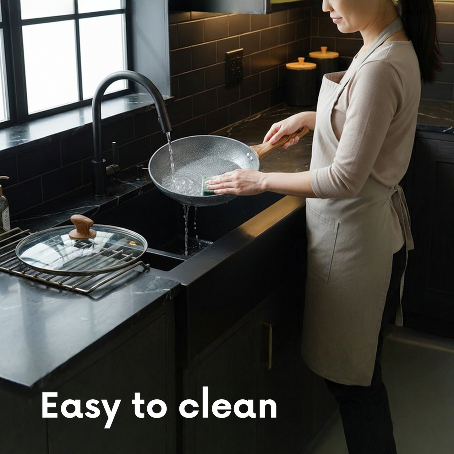 Cook with ease using this 28cm nonstick frying pan with lid. Featuring a PFOA-free non-stick surface, durable die-cast aluminium body, induction-compatible base, glass lid, and heat-resistant ergonomic handle, it’s perfect for versatile everyday cooking.