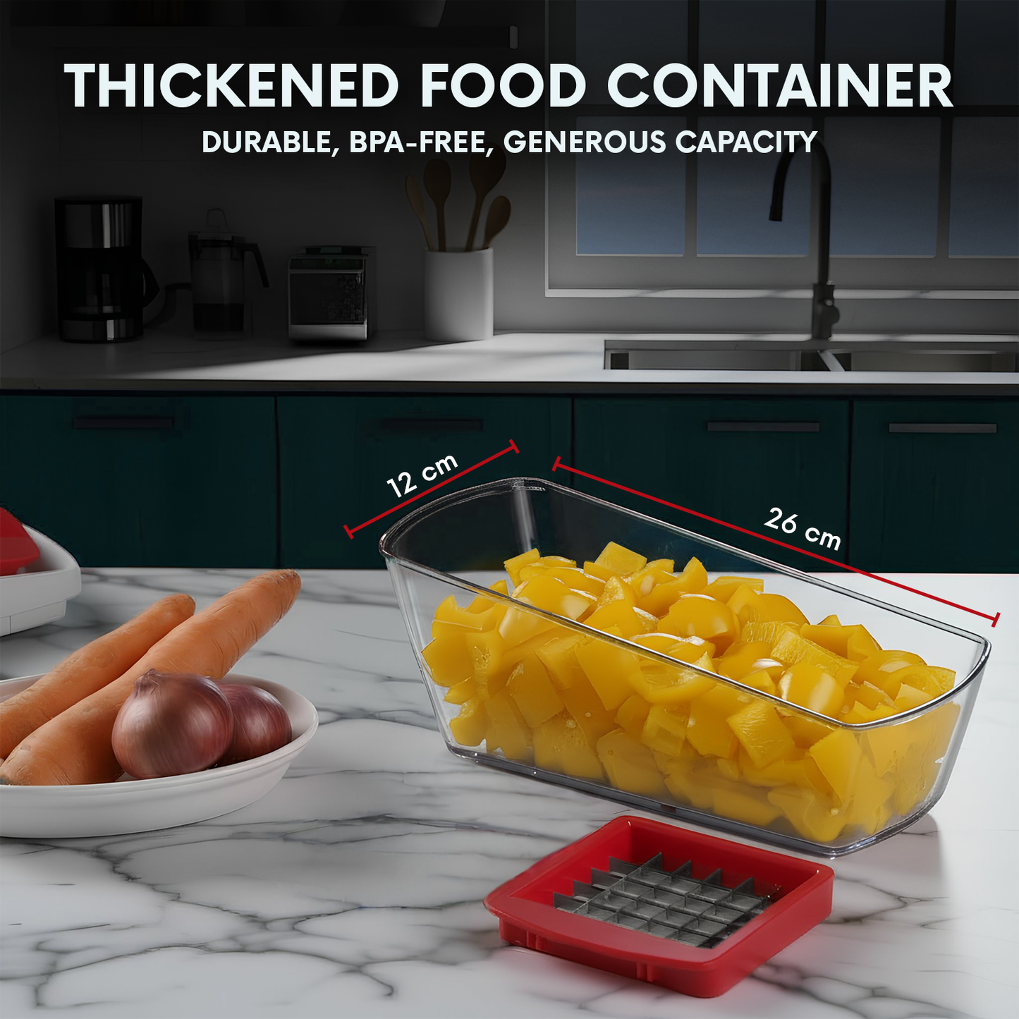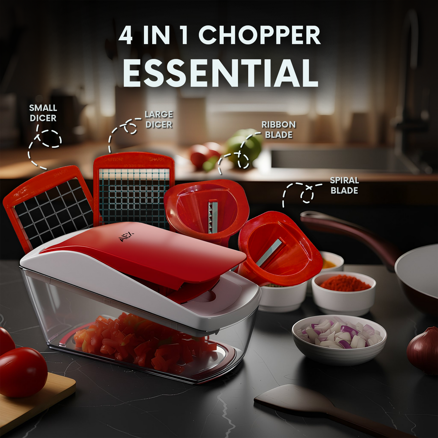 Simplify meal prep with this 4-in-1 vegetable chopper. Featuring four stainless-steel blades, a spacious BPA-free container, and safety accessories, it dices, slices, and spirals vegetables efficiently, making healthy cooking fast, safe, and convenient.