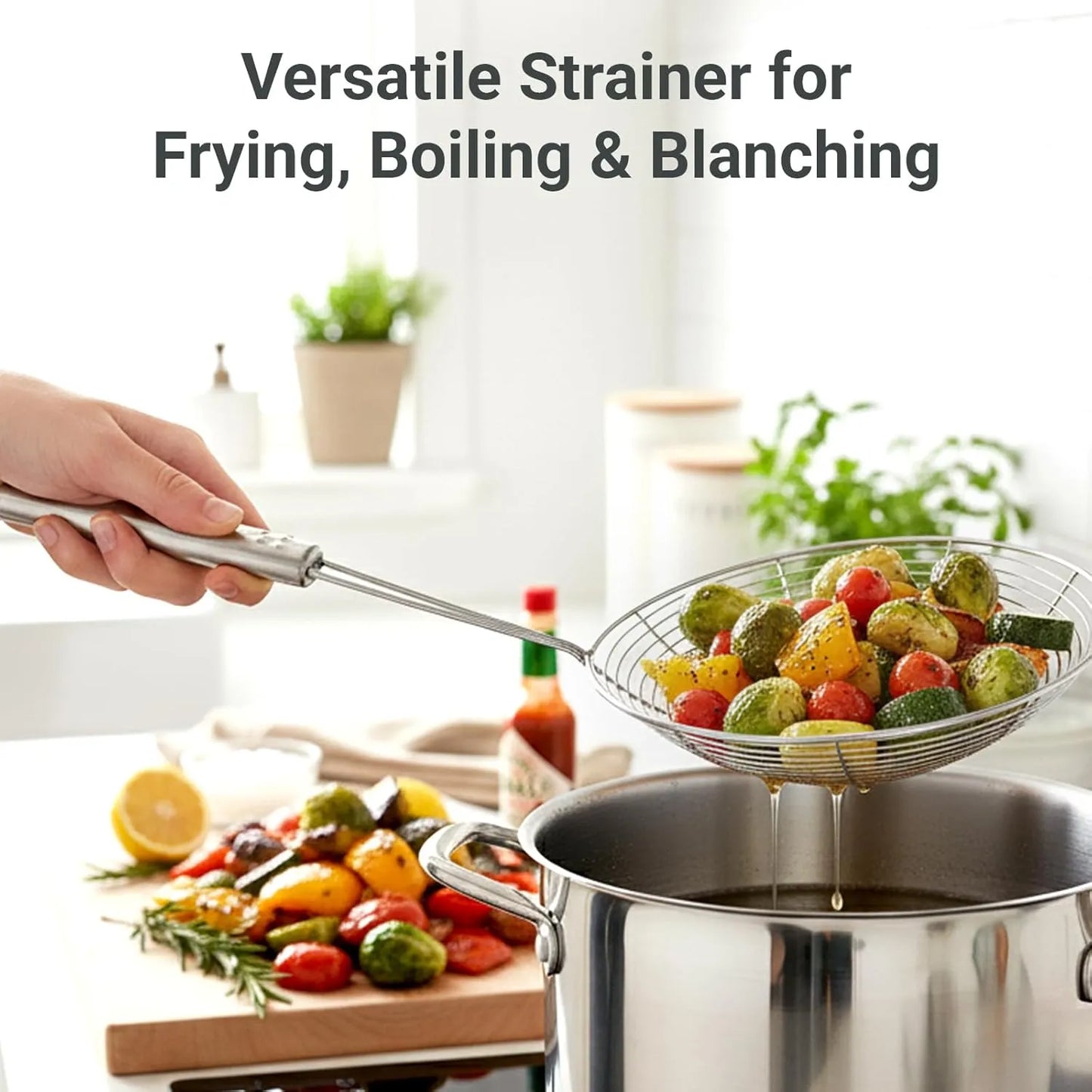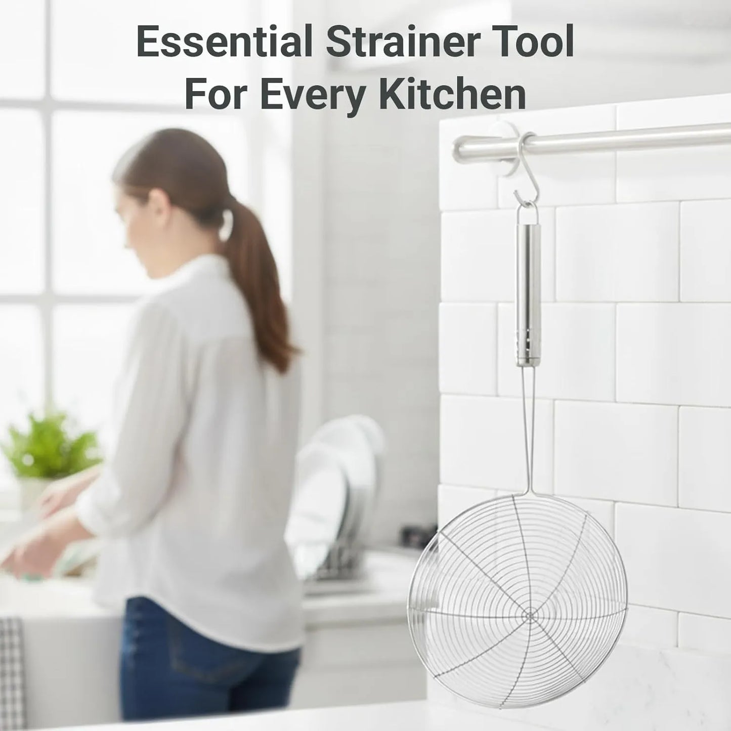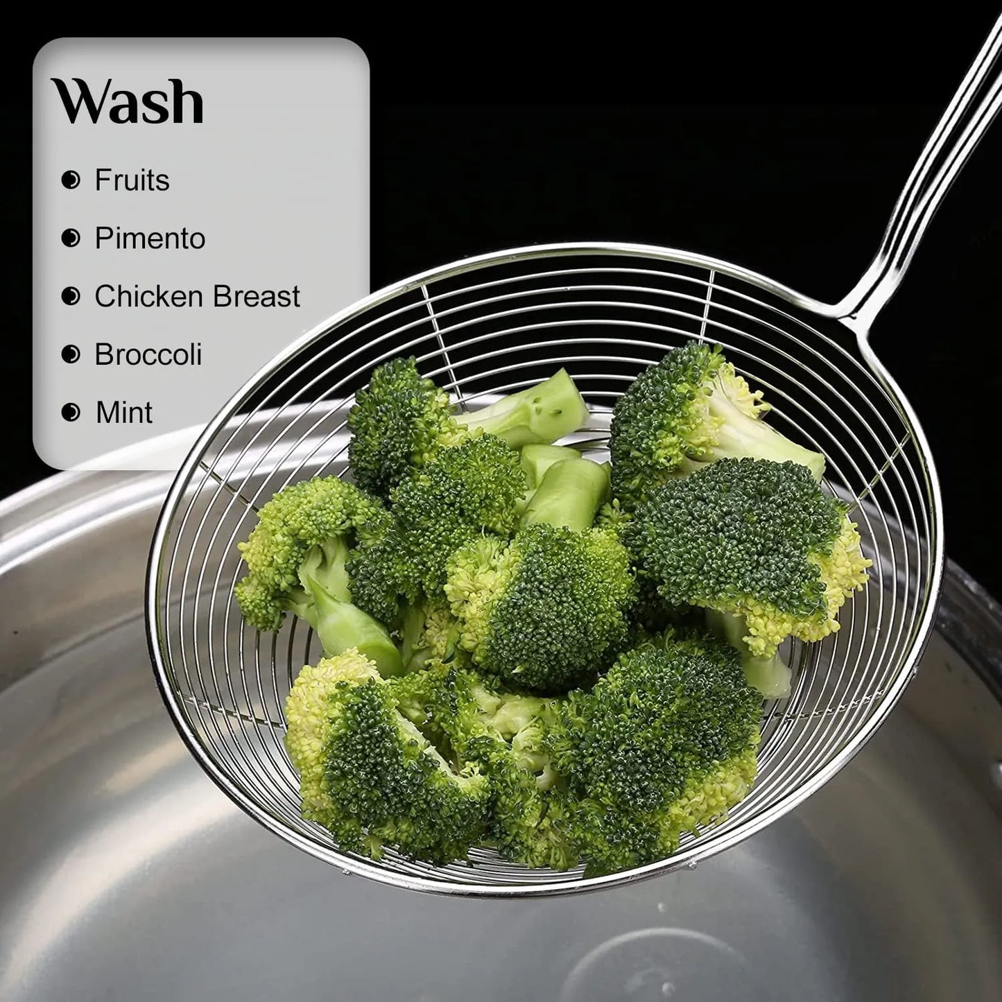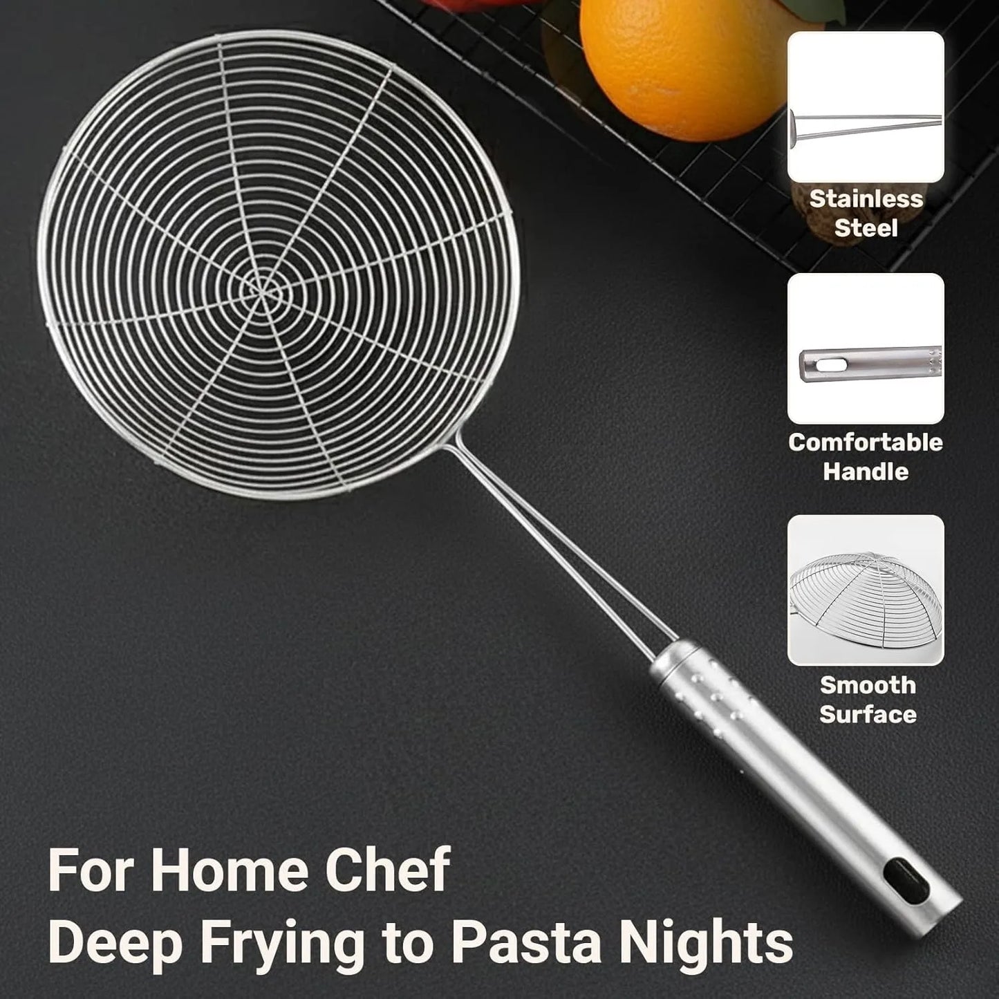 Upgrade your kitchen with this premium stainless steel skimmer spider. Its spiderweb mesh drains liquids efficiently while lifting food safely. The ergonomic handle with a hanging hole ensures comfort and convenient storage, making it perfect for frying, boiling, or washing food in both professional and home kitchens.
