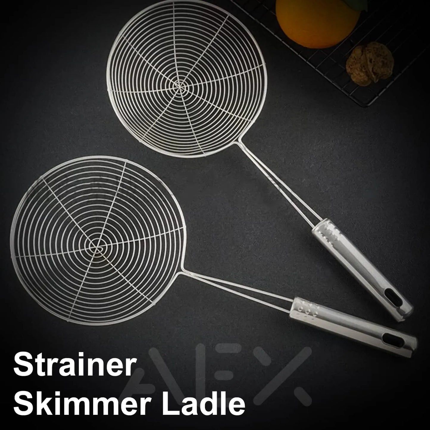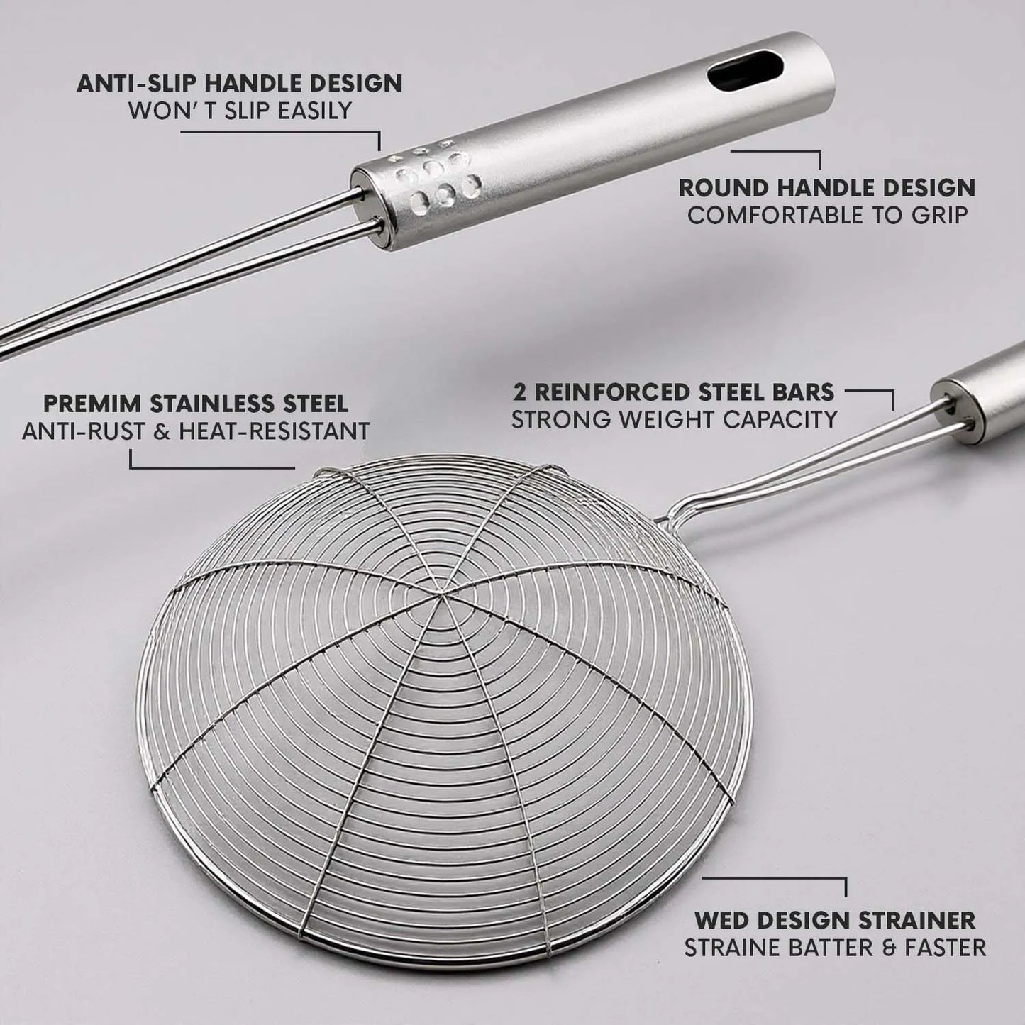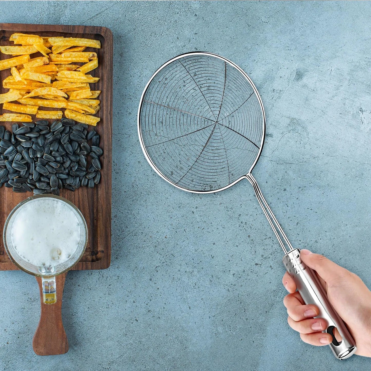 Upgrade your kitchen with this premium stainless steel skimmer spider. Its spiderweb mesh drains liquids efficiently while lifting food safely. The ergonomic handle with a hanging hole ensures comfort and convenient storage, making it perfect for frying, boiling, or washing food in both professional and home kitchens.
