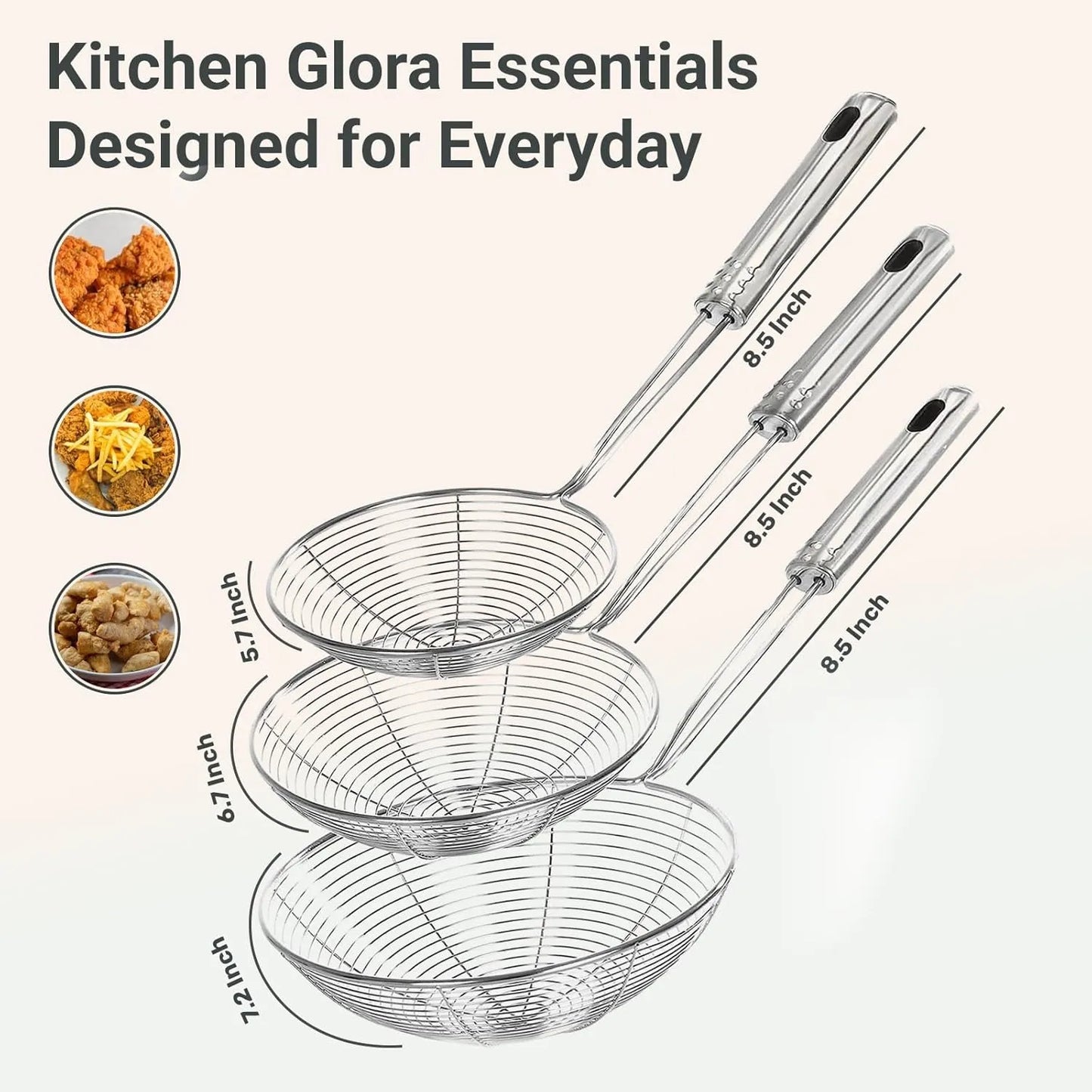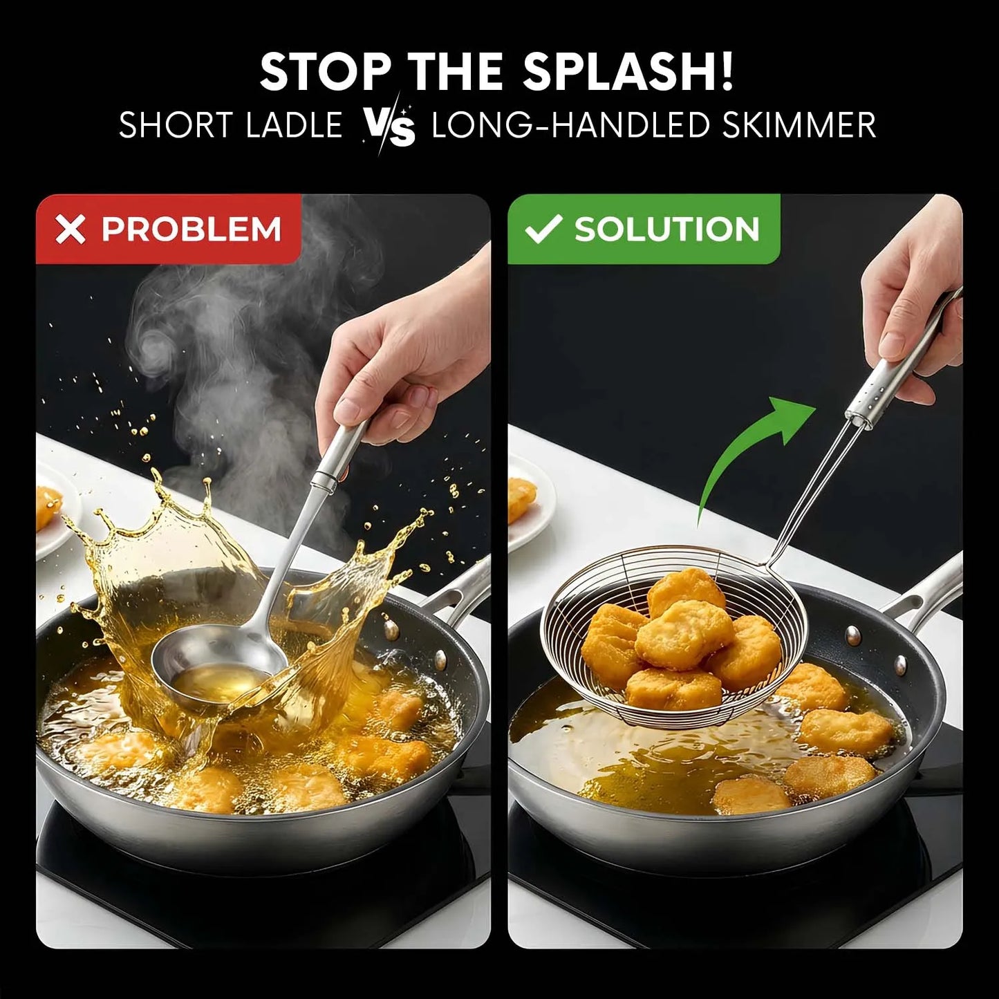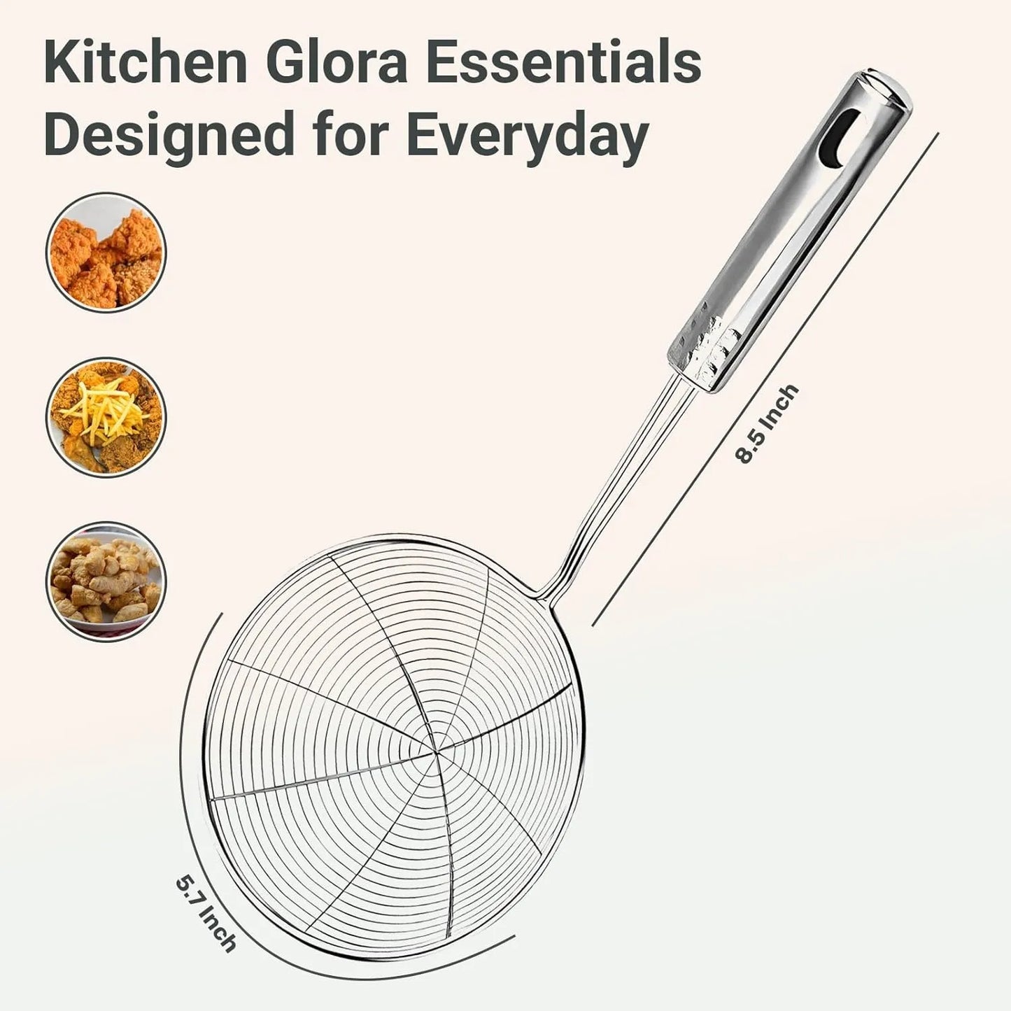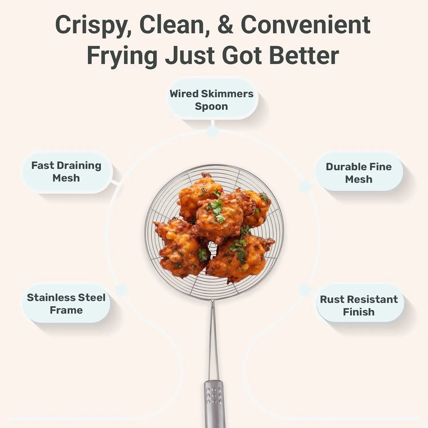 Upgrade your kitchen with this premium stainless steel skimmer spider. Its spiderweb mesh drains liquids efficiently while lifting food safely. The ergonomic handle with a hanging hole ensures comfort and convenient storage, making it perfect for frying, boiling, or washing food in both professional and home kitchens.