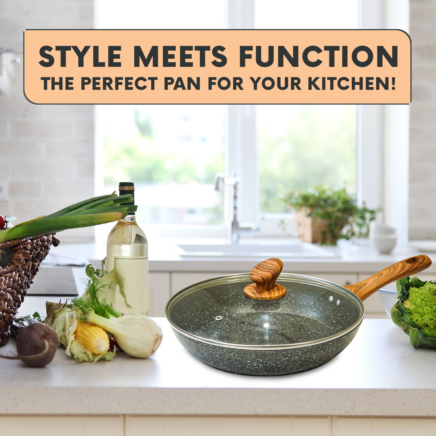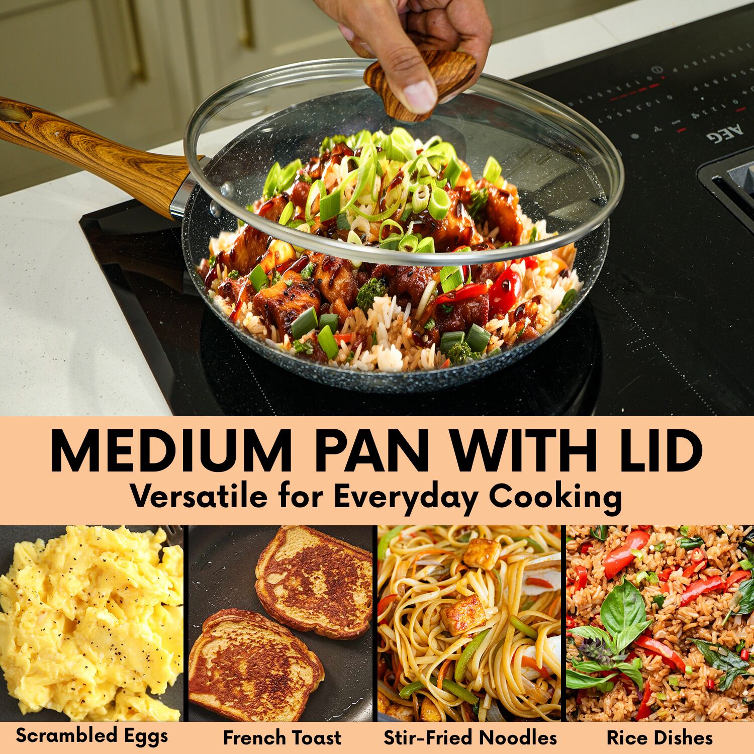 Featuring a glass lid with a wood-look knob, the frying pans with lid locks in flavour while giving visibility. Its ergonomic, heatproof handle adds comfort, with a removable design for storage.