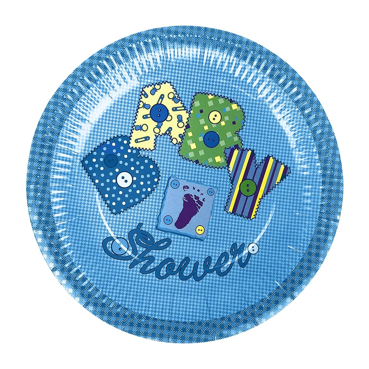 Make your baby shower memorable with these blue paper plate featuring charming baby-themed illustrations in soft, cheerful shades of blue. Perfect for adding a playful touch to your blue plates paper table setting.