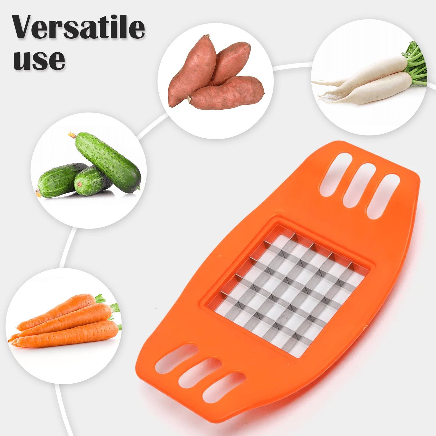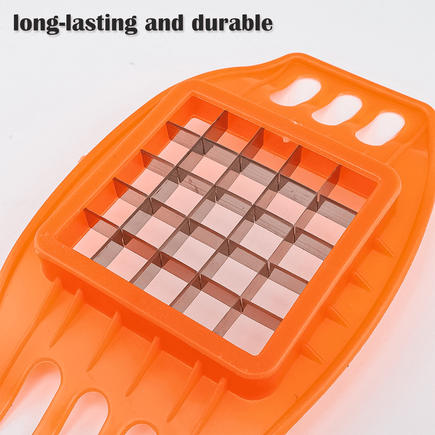 Constructed with a robust orange plastic body and high-quality metal blades, this potato chipper is long-lasting. Finger cutouts provide a secure grip while applying pressure, ensuring safe and comfortable cutting.