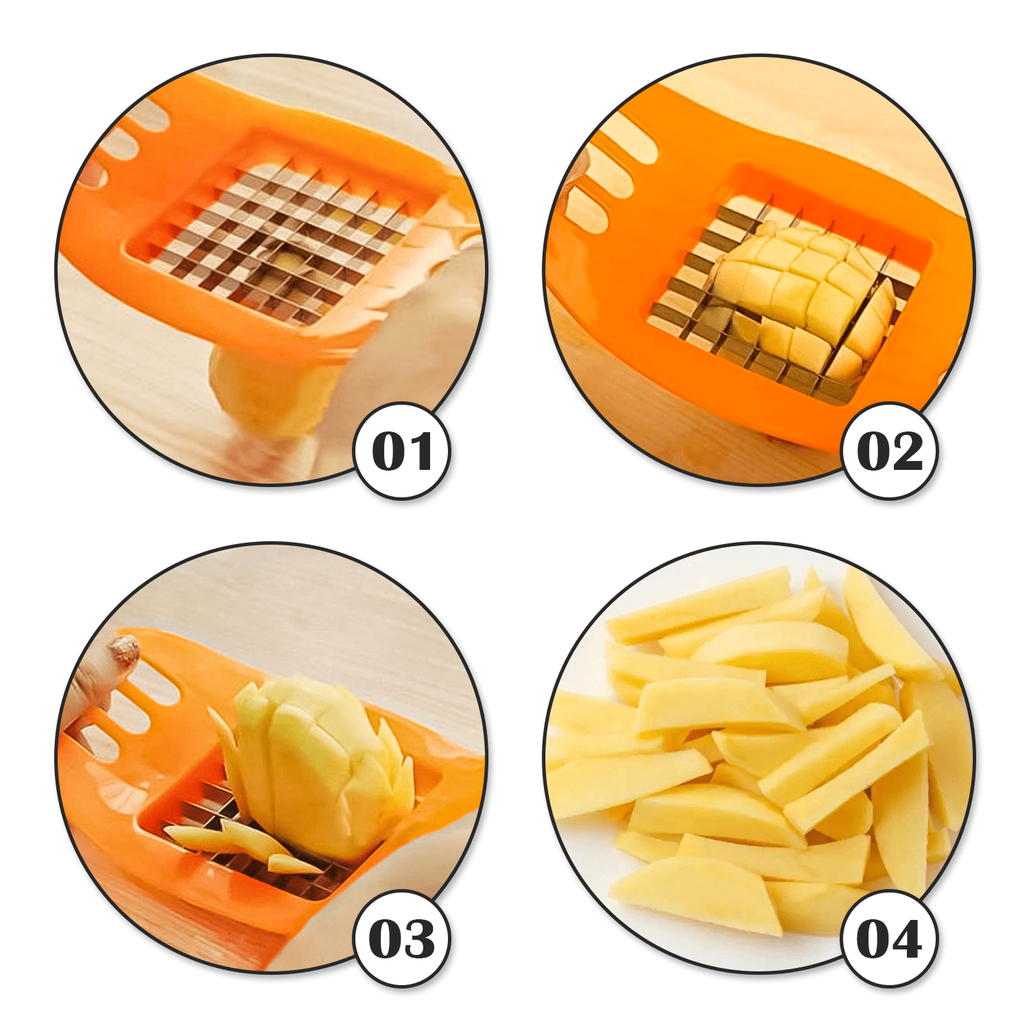 Using the chip slicer is simple: place a potato on the blade grid, press down, and the cutter slices it into uniform sticks. Perfect for homemade French fries, healthy snacks, and family meals.
