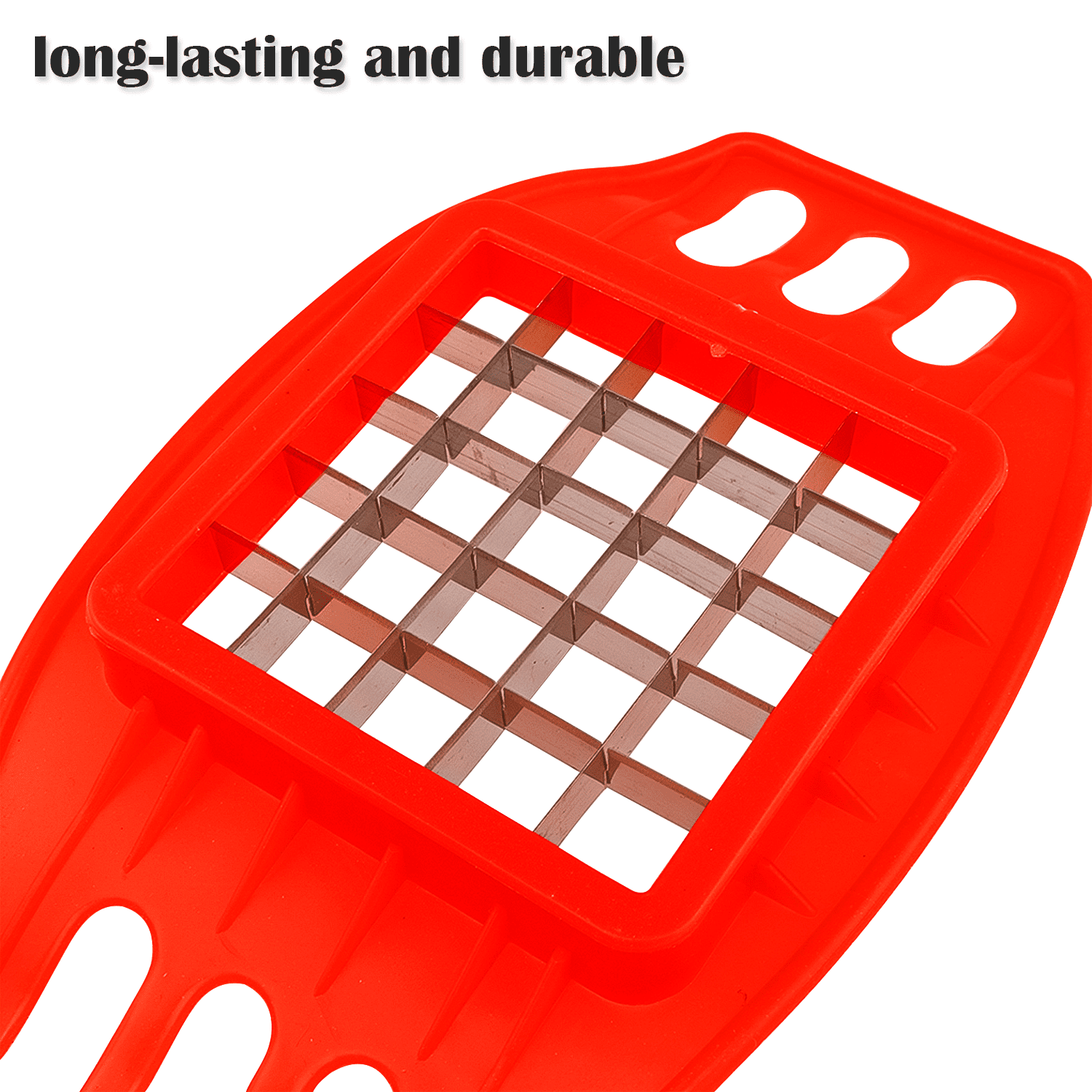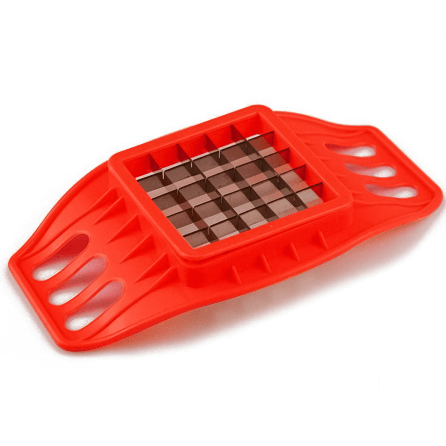 Crafted from sturdy red plastic, this chip cutter features finger grooves for a secure grip. The robust design of the Potato Chips Cutter guarantees long-lasting performance for both home and professional use.