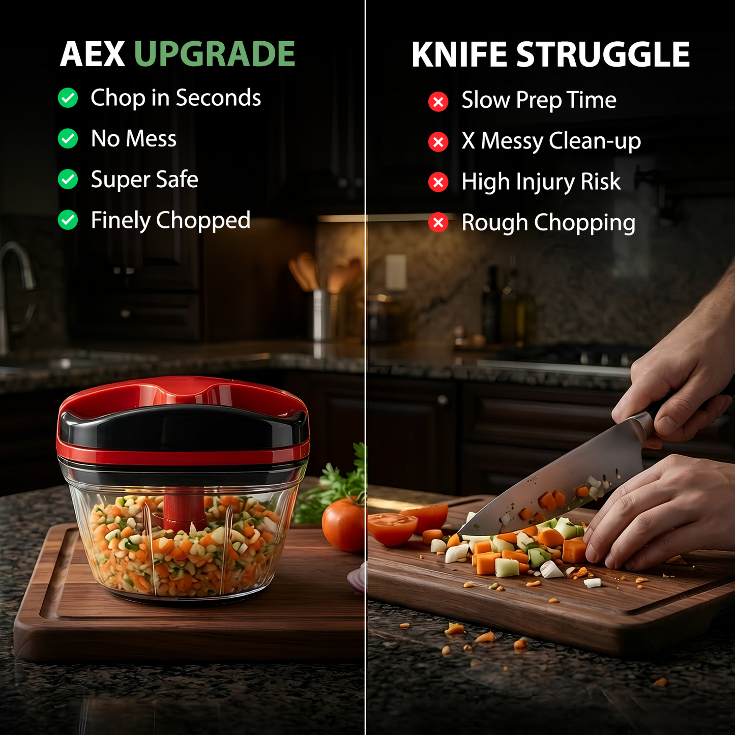 Make meal prep effortless with the AEX Pull-String Vegetable Chopper. Available in 250ml and 550ml sizes, it features sharp stainless steel blades and an easy-pull string mechanism for precise, consistent chopping of vegetables, herbs, nuts, and more. Compact, versatile, and dishwasher safe for everyday use.